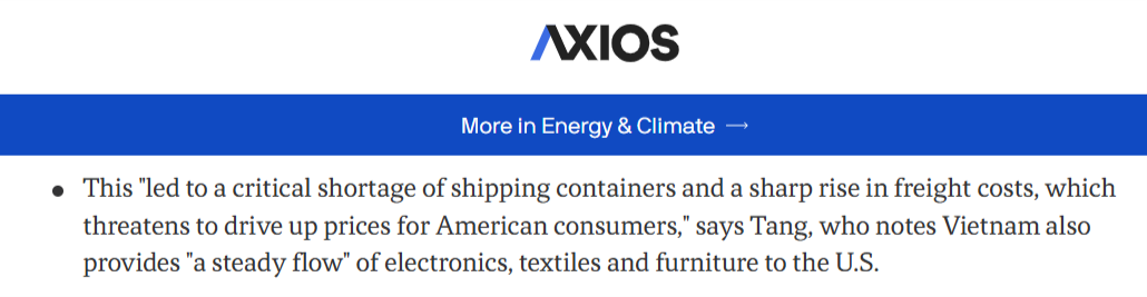 美国阿克西奥斯新闻网报道截图 报道说,当前伊朗战事正在伤害远离中东、且未直接参与冲突的国家。尽管美国避免了最严重的经济冲击,但专家警告说,这种情况可能很快就会发生变化。 报道称由于伊朗战事,菲律宾3月宣布国家进入紧急状态,并实施一周四天工作制,以应对燃料成本上涨。作为向美国供应半导体、电子元器件以及椰子油等农产品的主要出口国,菲律宾国内的任何不稳定都会立即对美国科技行业产生连锁反应,并对美国电子产品供应链造成重大风险。 越南是美国最大的服装供应国。受能源短缺影响,越南已被迫采取紧急措施,包括大幅增加燃煤发电量,并敦促民众居家办公。报道称,越南约80%至85%的石油从中东进口。由于战争影响,船只被迫绕行好望角,导致运输成本增加了30%至50%,“这导致了海运集装箱的严重短缺以及运费的急剧上涨,可能推高美国消费者的物价。”报道指出,除了纺织品,越南还是美国电子产品与家具的重要供应商。
