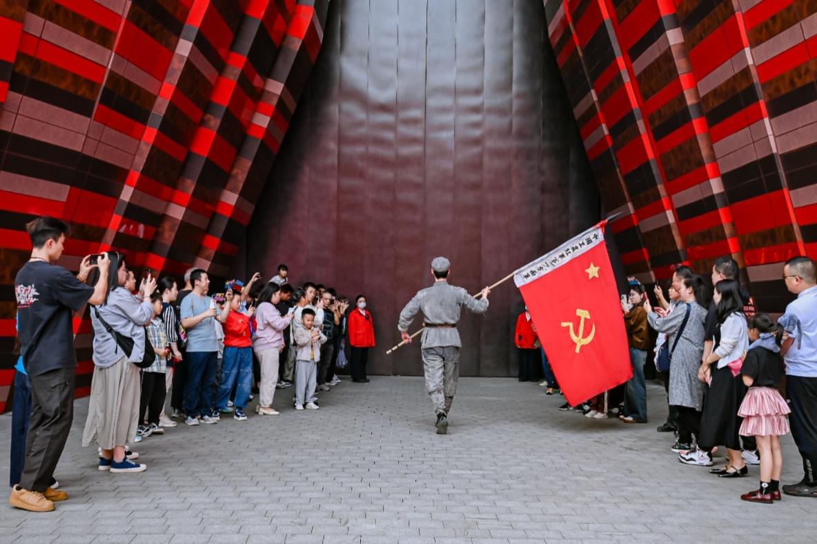 “红飘带”场馆游客络绎不绝 在贵阳,“红飘带”(贵州长征文化数字艺术馆)内没有传统的展柜和展板,取而代之的是全域沉浸式体验:观众仿佛置身于湘江边的战壕、赤水河上的竹筏、雪山草地的风雪之中,感受长征的艰辛与壮阔。 而在遵义,与“红飘带”并称“双子星”的《伟大转折》沉浸式演艺,以鲜活故事,展现信仰赋予青年的无畏勇气。贵州伟大转折文化发展有限公司市场部主任王礼明说:“我们通过红军战士的成长故事,展现信仰如何赋予革命青年力量。很多学生看完后说,原来长征不只是一段历史,更是一种选择。”