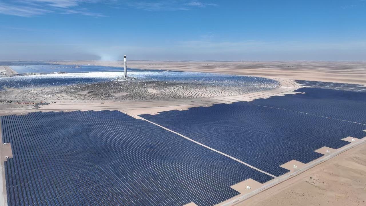 在阿拉伯联合酋长国迪拜的沙漠深处,一片蔚蓝的光伏板“海洋”在烈日下熠熠生辉:巍然耸立的262米集热塔与周围约7万面定日镜组成的巨大镜场,共同构成全球规模最大的光热光伏复合电站。6000多套槽式集热器在相当于6000多个标准足球场面积的园区中协同运作,捕捉沙漠中充沛的太阳能,并将其源源不断转化为清洁电能。