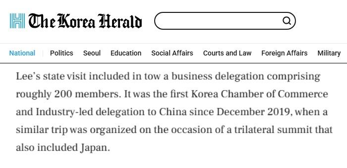 《韩国先驱报》的报道指出,李在明总统此次访华携规模约200人的商务代表团随行。这也是大韩商工会议所(韩国最大民间经济团体)自2019年12月中日韩领导人会议期间组织类似代表团后,时隔近四年首次率团访华。