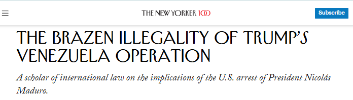 耶鲁大学法学院教授、全球法律挑战中心主任乌纳·海瑟薇(Oona Hathaway)在接受《纽约客》采访时表示,美国政府为行动辩护的法律论点均不成立,“没有任何理由能为在委内瑞拉的此次行动提供正当依据”。